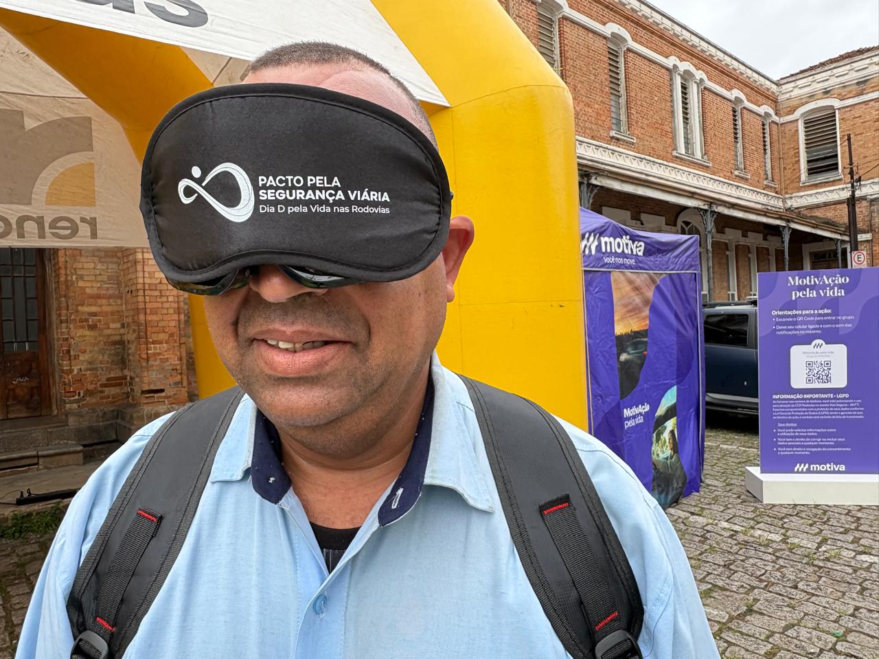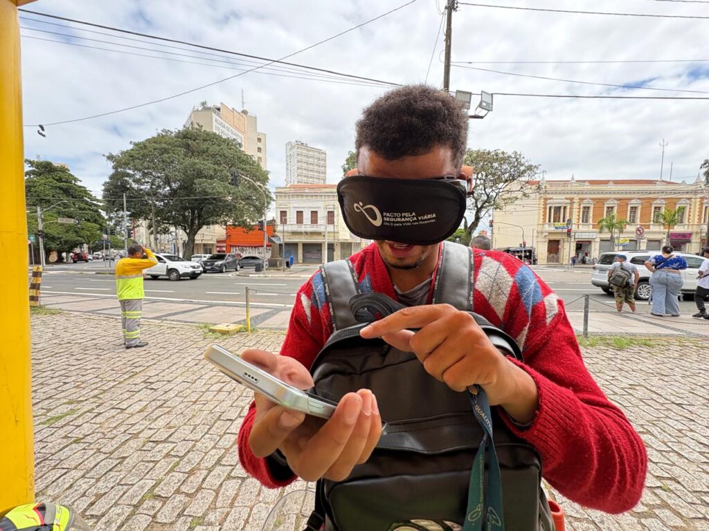 Na primeira ação, os participantes, utilizando um óculos simulador de embriaguez e uma venda, foram convidados a digitar uma frase no celular. A atividade demonstrou, de forma prática, as dificuldades de executar tarefas simples com os sentidos comprometidos, reforçando os perigos de direção e celular.